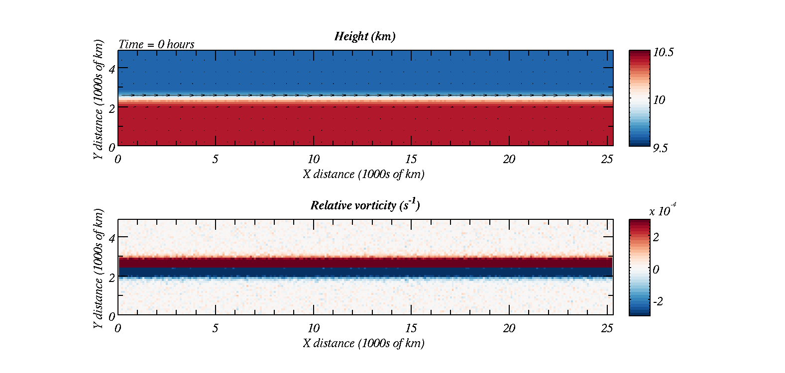Above shows the height of the fluid, with wind vectors superimposed as well as vorticity of the fluid plotted in the lower graph. We start with a jet and this breaks down into barotropic instability.